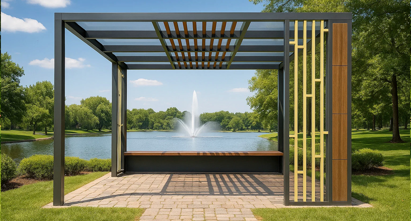 레이크뷰 프레임 퍼걸러 (Lakeview Frame Pergola)|PNDP-237 제품목록으로 바로가기 자료 및 바로가기 나라장터 바로연결 도면 다운로드 시공사진 보러가기 기타 물가 조망을 최대한 살린 개방형 구조에 세련된 수직 패턴을 더해, 자연 풍경을 액자처럼 담아내는 퍼걸러입니다. 밝은 옐로우 라인과 우드 패널이 포인트가 되어 공원·호수·리버파크에 어울리는 고급스러운 쉼터 공간을 완성합니다. 제품명 레이크뷰 프레임 퍼걸러 (Lakeview Frame Pergola)|PNDP-237 물품식별번호 24948853 규격 3,600 X 3,600 X 2,500(H) 재질 stl, galvanized, hard wood, polycarbonate,hpl 레이크뷰 프레임 퍼걸러 (Lakeview Frame Pergola)|PNDP-237 물품식별번호 24948853 규격 3,600 X 3,600 X 2,500(H) 재질 stl, galvanized, hard wood, polycarbonate,hpl 기타 물가 조망을 최대한 살린 개방형 구조에 세련된 수직 패턴을 더해, 자연 풍경을 액자처럼 담아내는 퍼걸러입니다. 밝은 옐로우 라인과 우드 패널이 포인트가 되어 공원·호수·리버파크에 어울리는 고급스러운 쉼터 공간을 완성합니다. 자료 및 바로가기 나라장터 바로연결 도면 다운로드 시공사진 보러가기