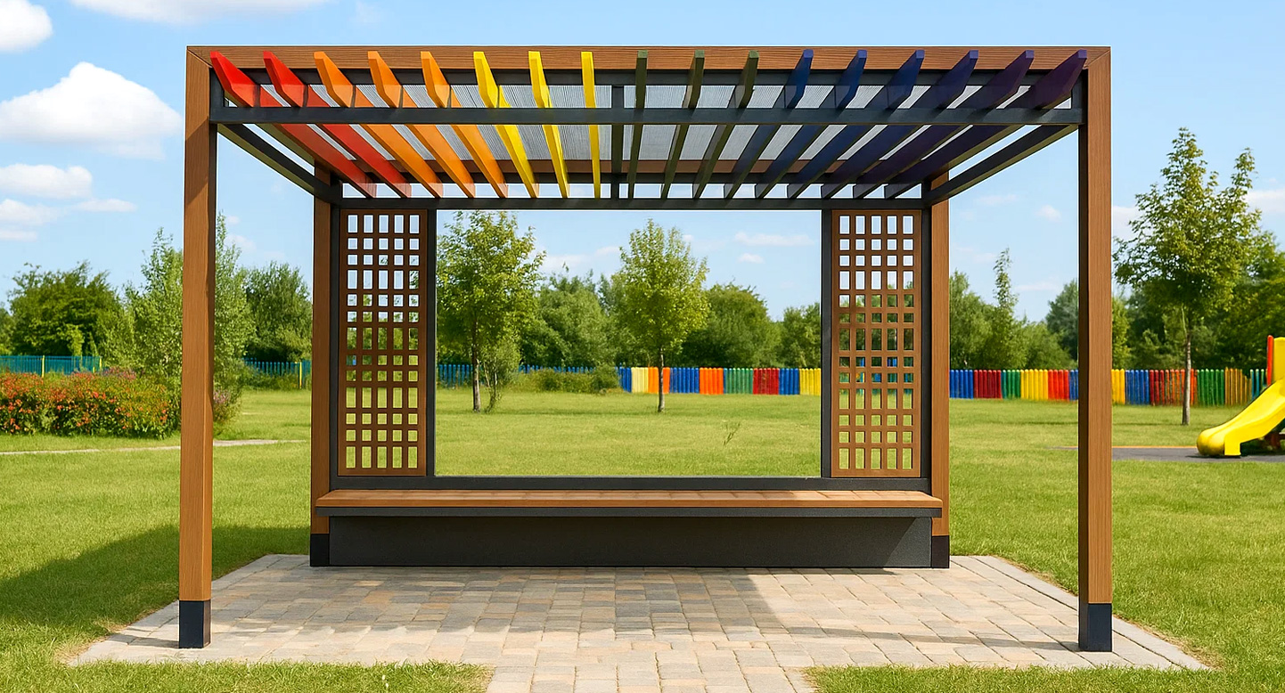 레인보우 브릿지 퍼걸러 (Rainbow Bridge Pergola|PNDP-235 제품목록으로 바로가기 자료 및 바로가기 나라장터 바로연결 도면 다운로드 시공사진 보러가기 기타 지붕을 따라 흐르는 레인보우 컬러 라인이 밝은 에너지를 전달하며, 공간 전체에 활기와 즐거움을 더해주는 감성형 퍼걸러입니다. 아이들부터 가족 모두가 즐길 수 있는 생동감 있는 휴식 공간을 목표로 설계했습니다. 제품명 레인보우 브릿지 퍼걸러 (Rainbow Bridge Pergola|PNDP-235 물품식별번호 24948851 규격 3,800 X 3,200 X 2,600(H) 재질 stl, galvanized, hard wood, polycarbonate 레인보우 브릿지 퍼걸러 (Rainbow Bridge Pergola|PNDP-235 물품식별번호 24948851 규격 3,800 X 3,200 X 2,600(H) 재질 stl, galvanized, hard wood, polycarbonate 기타 지붕을 따라 흐르는 레인보우 컬러 라인이 밝은 에너지를 전달하며, 공간 전체에 활기와 즐거움을 더해주는 감성형 퍼걸러입니다. 아이들부터 가족 모두가 즐길 수 있는 생동감 있는 휴식 공간을 목표로 설계했습니다. 자료 및 바로가기 나라장터 바로연결 도면 다운로드 시공사진 보러가기