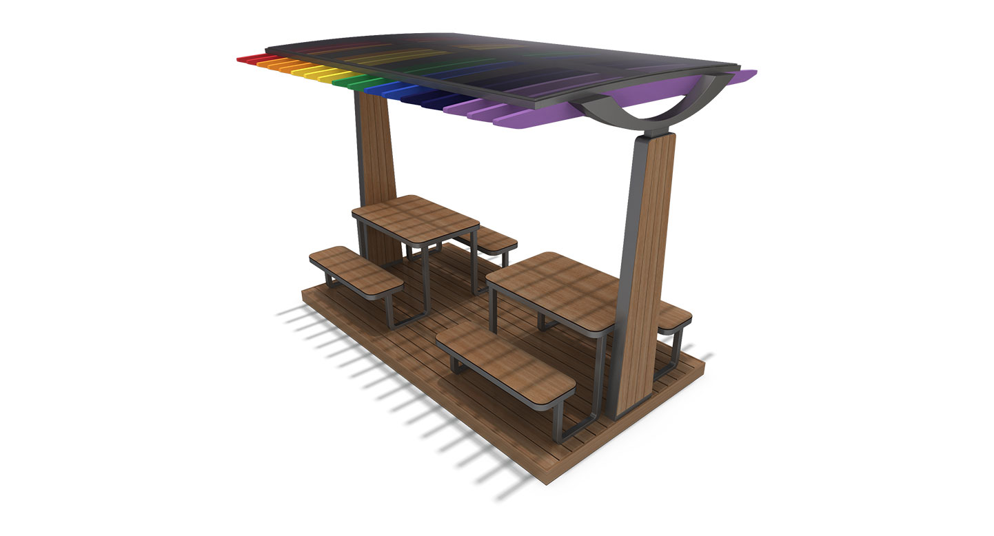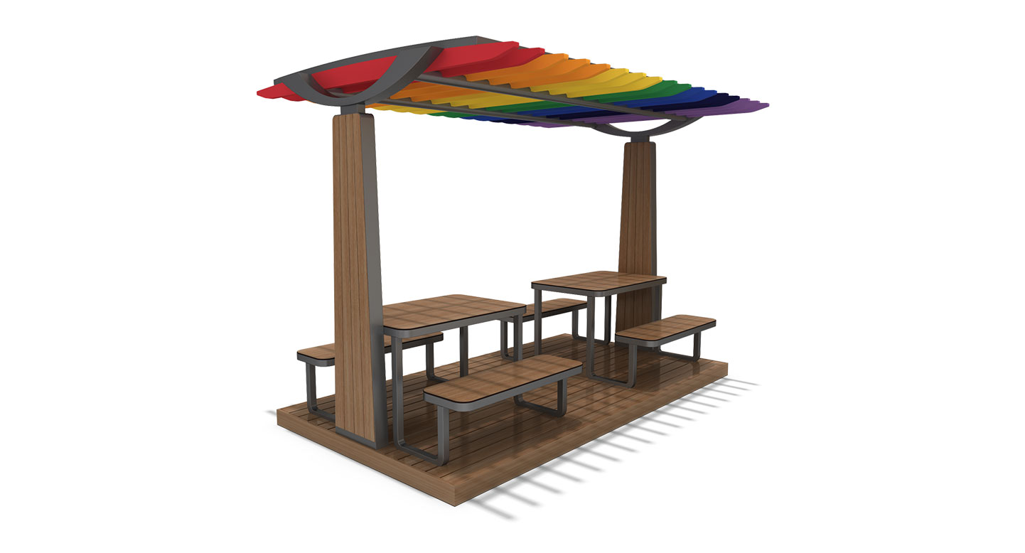 레인보우 파티오 (Rainbow Patio)|PNDP-910 제품목록으로 바로가기 자료 및 바로가기 나라장터 바로연결 도면 다운로드 시공사진 보러가기 기타 레인보우 슬랫 지붕과 우드 데크를 조합해 밝고 활기찬 분위기를 만들고, 다인용 테이블·벤치를 일체화해 자연스럽게 모여 쉬고 대화할 수 있는 커뮤니티형 쉼터입니다. 제품명 레인보우 파티오 (Rainbow Patio)|PNDP-910 물품식별번호 24955974 규격 3,500 X 2,600 X 2,640(H) 재질 stl, hard wood, hpl, polycarbonate 레인보우 파티오 (Rainbow Patio)|PNDP-910 물품식별번호 24955974 규격 3,500 X 2,600 X 2,640(H) 재질 stl, hard wood, hpl, polycarbonate 기타 레인보우 슬랫 지붕과 우드 데크를 조합해 밝고 활기찬 분위기를 만들고, 다인용 테이블·벤치를 일체화해 자연스럽게 모여 쉬고 대화할 수 있는 커뮤니티형 쉼터입니다. 자료 및 바로가기 나라장터 바로연결 도면 다운로드 시공사진 보러가기