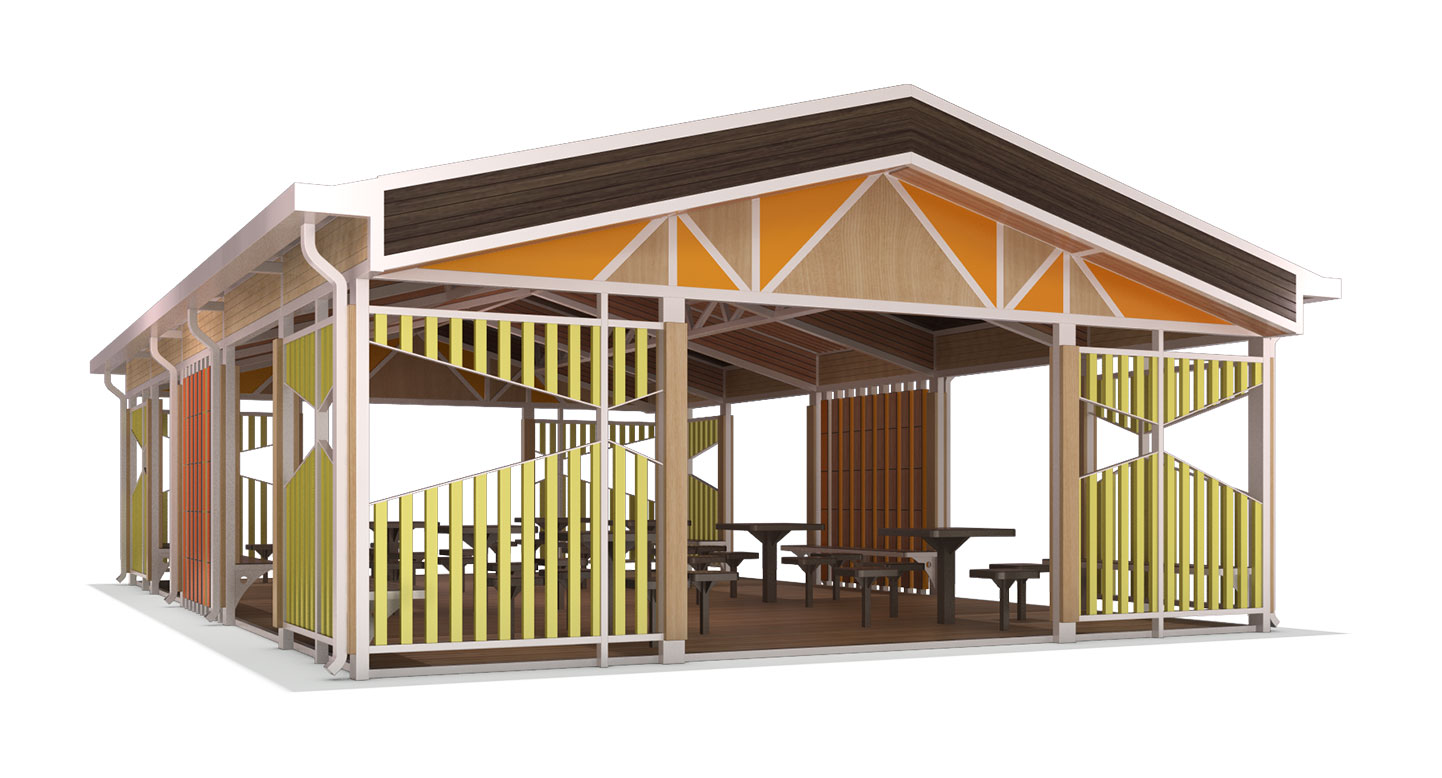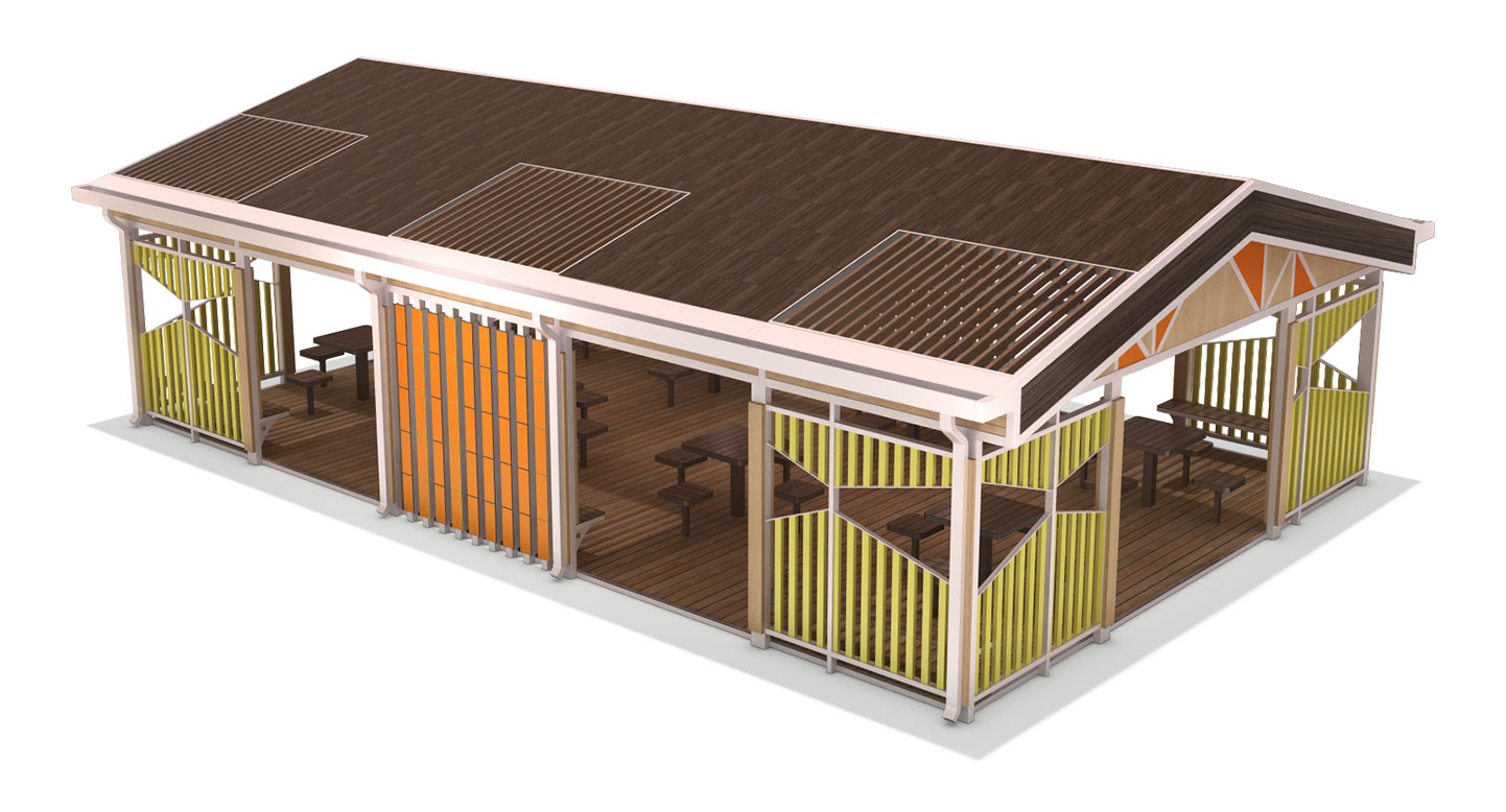 라임브리즈 파빌리온 (Lime Breeze Pavilion)|PNDP-005 제품목록으로 바로가기 자료 및 바로가기 나라장터 바로연결 도면 다운로드 시공사진 보러가기 기타 라임 슬랫과 우드톤 지붕으로 밝고 경쾌한 분위기를 만든 파빌리온입니다. 측면 루버가 빛과 바람을 자연스럽게 조절하며, 내부는 단체 이용이 가능한 넓은 휴식 공간으로 구성되었습니다. 제품명 라임브리즈 파빌리온 (Lime Breeze Pavilion)|PNDP-005 물품식별번호 24965763 규격 12,000 X 8,000 X 3,100(H) 재질 stl, hard wood, galvanized, polycarbonate, hpl 라임브리즈 파빌리온 (Lime Breeze Pavilion)|PNDP-005 물품식별번호 24965763 규격 12,000 X 8,000 X 3,100(H) 재질 stl, hard wood, galvanized, polycarbonate, hpl 기타 라임 슬랫과 우드톤 지붕으로 밝고 경쾌한 분위기를 만든 파빌리온입니다. 측면 루버가 빛과 바람을 자연스럽게 조절하며, 내부는 단체 이용이 가능한 넓은 휴식 공간으로 구성되었습니다. 자료 및 바로가기 나라장터 바로연결 도면 다운로드 시공사진 보러가기