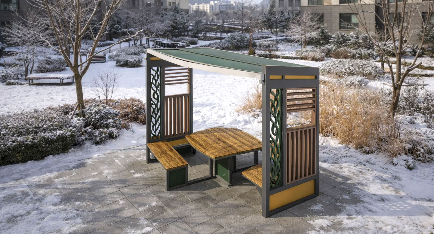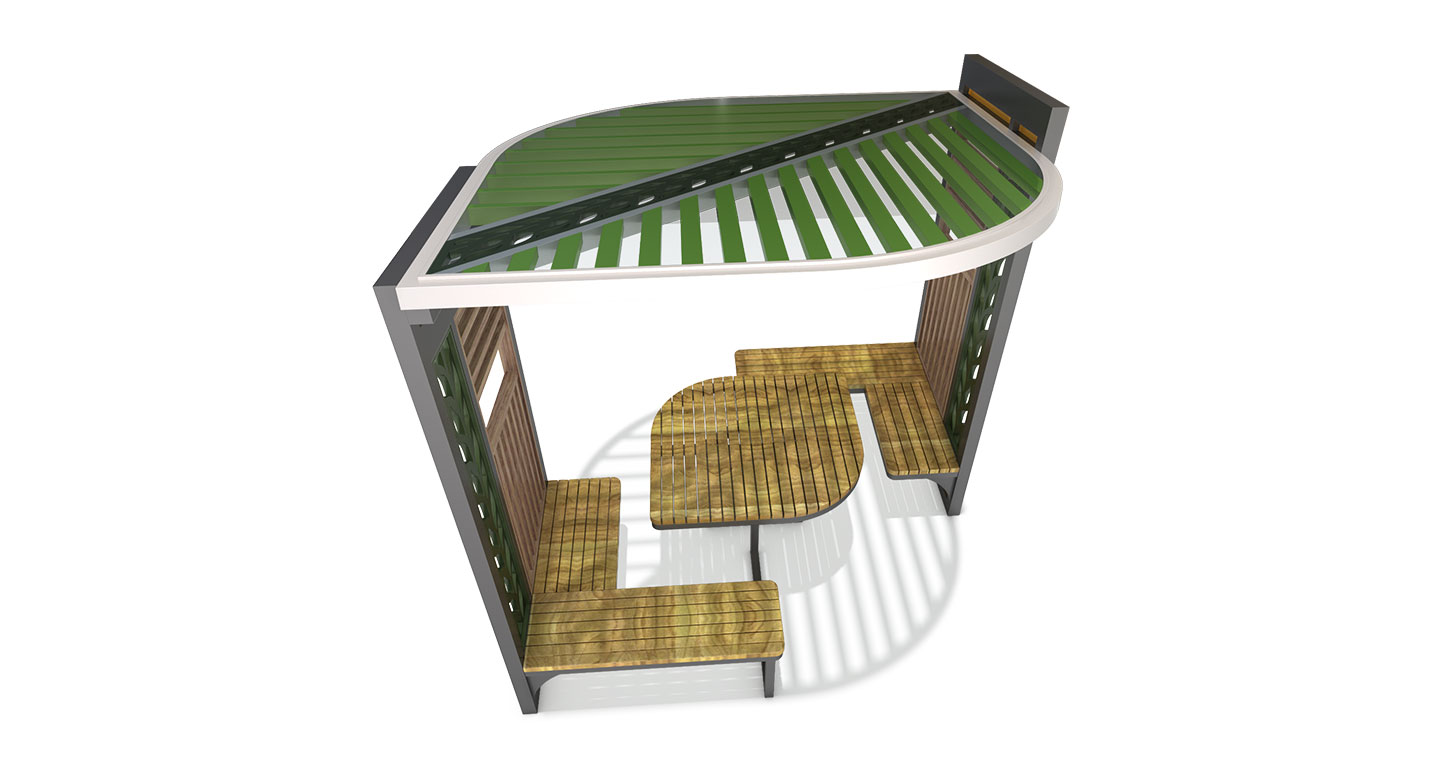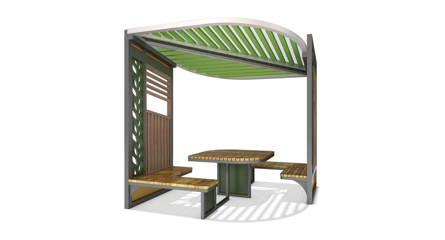 리프 테라스 파빌리온 (Leaf Terrace Pavilion)|PNDP-916 제품목록으로 바로가기 자료 및 바로가기 나라장터 바로연결 도면 다운로드 시공사진 보러가기 기타 넓게 펼친 잎사귀 지붕 아래, 테이블과 벤치를 일체형으로 구성한 소통형 쉼터입니다. 자연 질감의 우드 슬랫과 그린 패널이 어우러져 공원·단지에 포근한 분위기를 제공합니다. 제품명 리프 테라스 파빌리온 (Leaf Terrace Pavilion)|PNDP-916 물품식별번호 24965870 규격 2,650 X 2,475 X 2,808(H) 재질 stl, galvanized, birch plywood, hard wood, polycarbonate 리프 테라스 파빌리온 (Leaf Terrace Pavilion)|PNDP-916 물품식별번호 24965870 규격 2,650 X 2,475 X 2,808(H) 재질 stl, galvanized, birch plywood, hard wood, polycarbonate 기타 넓게 펼친 잎사귀 지붕 아래, 테이블과 벤치를 일체형으로 구성한 소통형 쉼터입니다. 자연 질감의 우드 슬랫과 그린 패널이 어우러져 공원·단지에 포근한 분위기를 제공합니다. 자료 및 바로가기 나라장터 바로연결 도면 다운로드 시공사진 보러가기