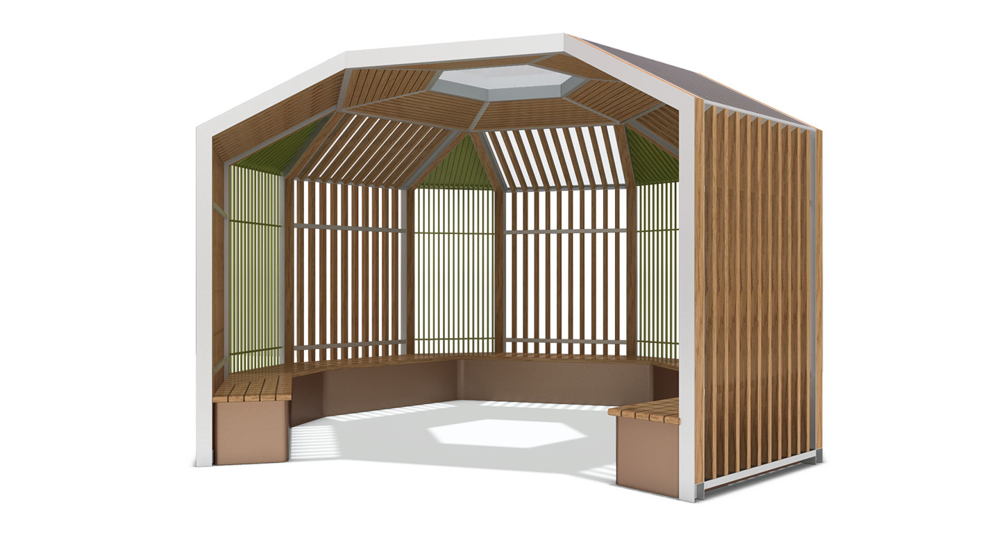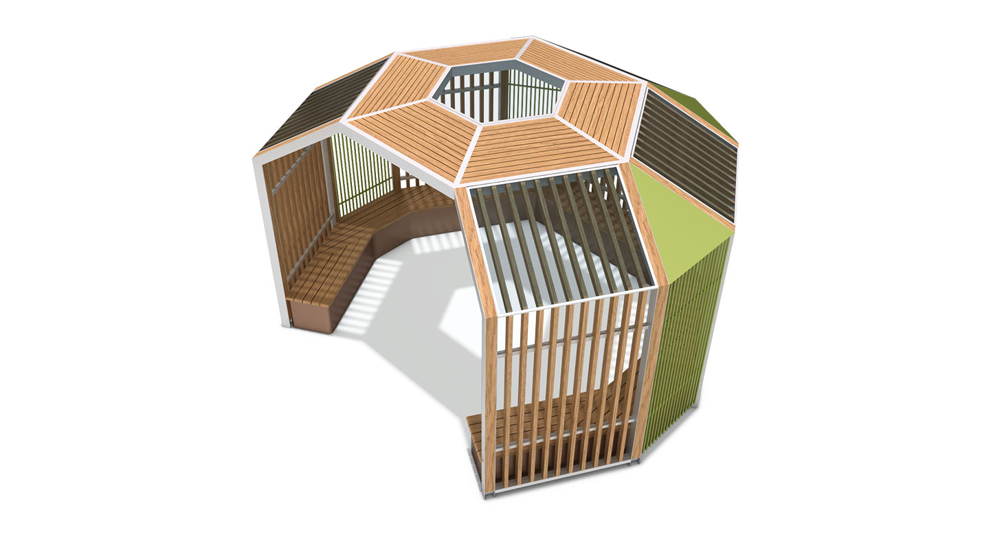 헥사 포레스트 파빌리온 (Hexa Forest Pavilion)|PNDP-511 제품목록으로 바로가기 자료 및 바로가기 나라장터 바로연결 도면 다운로드 시공사진 보러가기 기타 육각형 구조를 모듈화해 제작한 파빌리온으로, 나무 슬랫과 컬러 패널이 자연친화적인 분위기를 만듭니다. 내부의 곡선형 벤치와 개방형 루버가 바람·빛을 부드럽게 받아들이는 숲속 쉼터 느낌을 제공합니다. 제품명 헥사 포레스트 파빌리온 (Hexa Forest Pavilion)|PNDP-511 물품식별번호 24955939 규격 4,650 X 4,027 X 2,860(H) 재질 stl, galvanized, hard wood, polycarbonate 헥사 포레스트 파빌리온 (Hexa Forest Pavilion)|PNDP-511 물품식별번호 24955939 규격 4,650 X 4,027 X 2,860(H) 재질 stl, galvanized, hard wood, polycarbonate 기타 육각형 구조를 모듈화해 제작한 파빌리온으로, 나무 슬랫과 컬러 패널이 자연친화적인 분위기를 만듭니다. 내부의 곡선형 벤치와 개방형 루버가 바람·빛을 부드럽게 받아들이는 숲속 쉼터 느낌을 제공합니다. 자료 및 바로가기 나라장터 바로연결 도면 다운로드 시공사진 보러가기