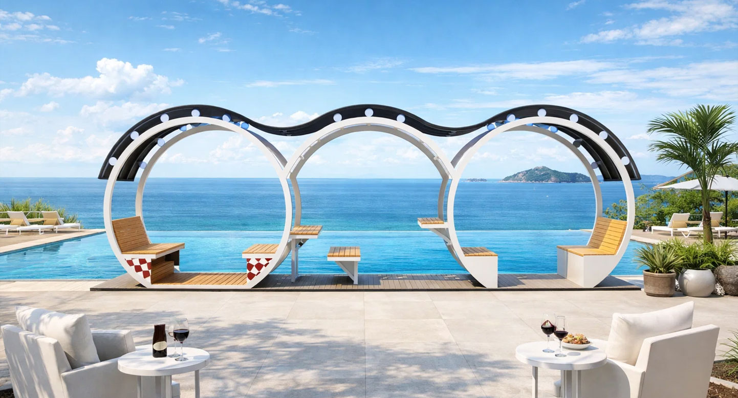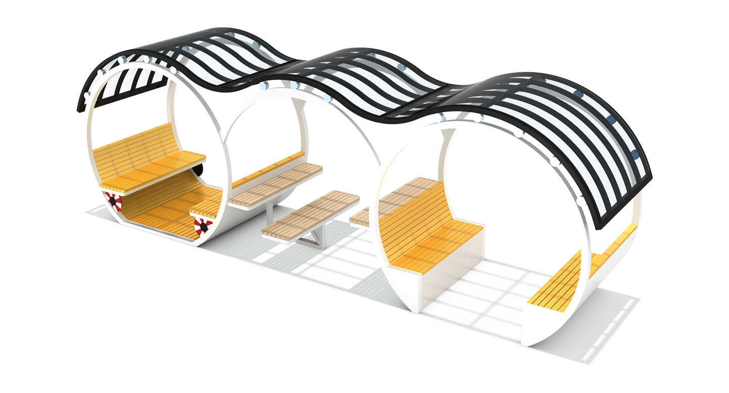 웨이브링 파빌리온 (Wavering Pavilion)|PNDP-1132 제품목록으로 바로가기 자료 및 바로가기 나라장터 바로연결 도면 다운로드 시공사진 보러가기 기타 물결처럼 흐르는 루프와 원형 구조가 특징인 연속형 쉼터로, 벤치·테이블 구성이 다양해 여러 이용자가 동시에 편하게 머물 수 있습니다. 블랙 루프와 우드 톤이 대비되어 세련된 분위기를 줍니다. 제품명 웨이브링 파빌리온 (Wavering Pavilion)|PNDP-1132 물품식별번호 24971892 규격 7,172 X 1,660 X 2,437(H) 재질 stl, galvanized, hard wood, hpl, polycarbonate 웨이브링 파빌리온 (Wavering Pavilion)|PNDP-1132 물품식별번호 24971892 규격 7,172 X 1,660 X 2,437(H) 재질 stl, galvanized, hard wood, hpl, polycarbonate 기타 물결처럼 흐르는 루프와 원형 구조가 특징인 연속형 쉼터로, 벤치·테이블 구성이 다양해 여러 이용자가 동시에 편하게 머물 수 있습니다. 블랙 루프와 우드 톤이 대비되어 세련된 분위기를 줍니다. 자료 및 바로가기 나라장터 바로연결 도면 다운로드 시공사진 보러가기