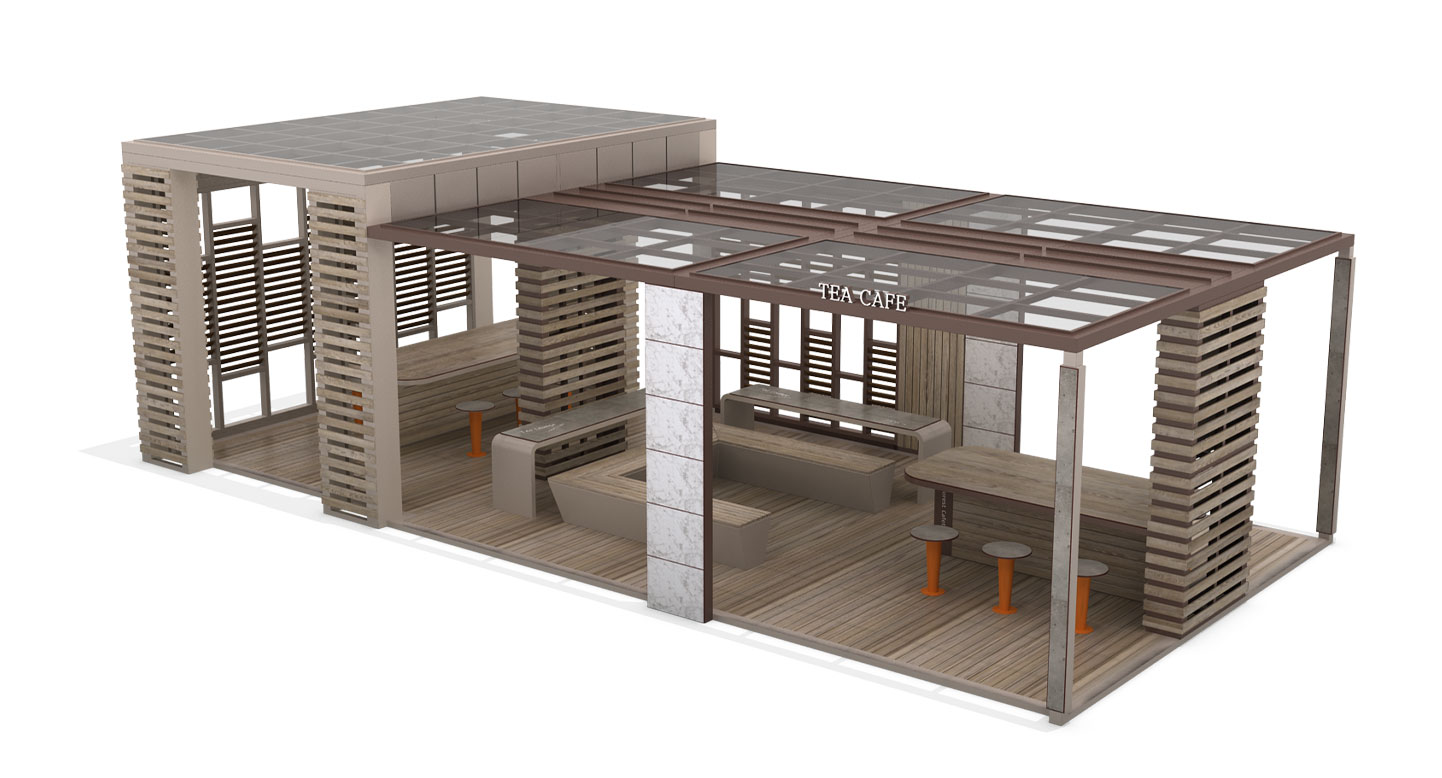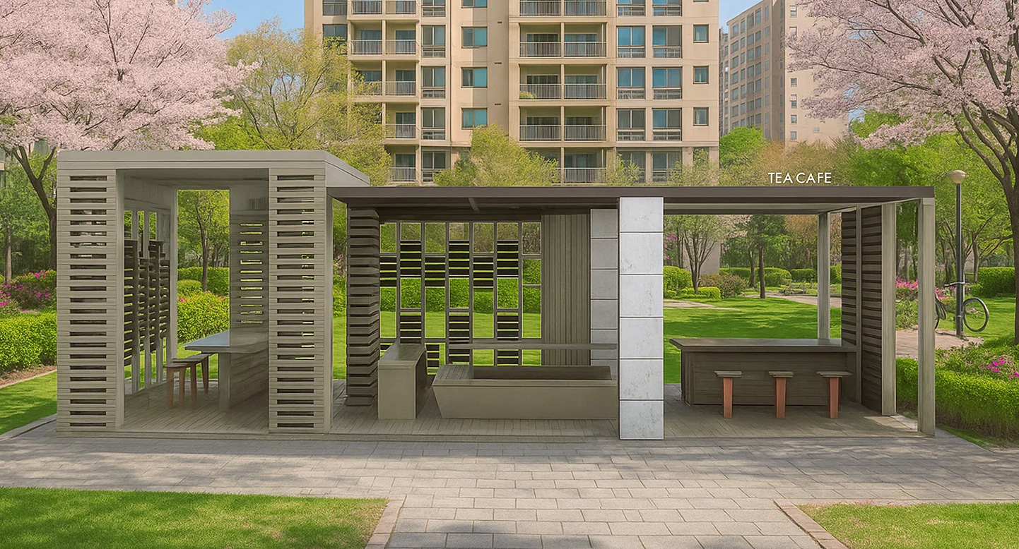 티 카페 라운지 (Tea Café Lounge)|PNDP-051 제품목록으로 바로가기 자료 및 바로가기 나라장터 바로연결 도면 다운로드 시공사진 보러가기 기타 슬릿 패널과 우드 톤을 조합한 감성형 쉼터로, 테이블·벤치·바테이블을 배치해 휴식과 소규모 커뮤니티 활동이 가능한 카페형 라운지 공간입니다. 제품명 티 카페 라운지 (Tea Café Lounge)|PNDP-051 물품식별번호 25953048 규격 10,500 x 5,000 x 3,260(H) 재질 stl, hard wood, galvanized, polycarbonate, hpl 티 카페 라운지 (Tea Café Lounge)|PNDP-051 물품식별번호 25953048 규격 10,500 x 5,000 x 3,260(H) 재질 stl, hard wood, galvanized, polycarbonate, hpl 기타 슬릿 패널과 우드 톤을 조합한 감성형 쉼터로, 테이블·벤치·바테이블을 배치해 휴식과 소규모 커뮤니티 활동이 가능한 카페형 라운지 공간입니다. 자료 및 바로가기 나라장터 바로연결 도면 다운로드 시공사진 보러가기