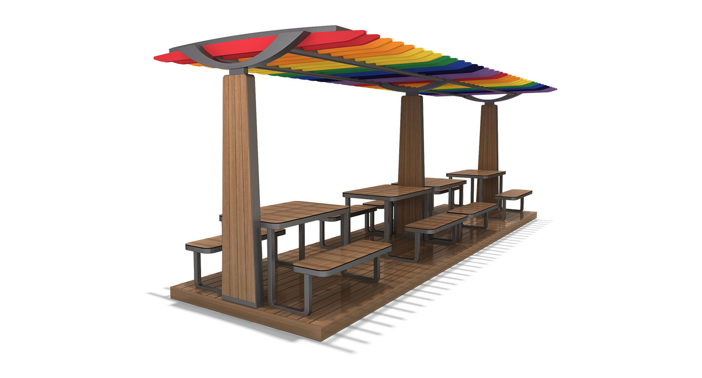 레인보우 피크닉 쉼터(Rainbow Picnic Shelter)|PNDP-910-2 제품목록으로 바로가기 자료 및 바로가기 나라장터 바로연결 도면 다운로드 시공사진 보러가기 기타 컬러 지붕과 테이블 일체형 구성으로 모임과 휴식이 모두 가능한 활기 있는 쉼터입니다. 제품명 레인보우 피크닉 쉼터(Rainbow Picnic Shelter)|PNDP-910-2 물품식별번호 24955975 규격 6,900 X 2,600 X 2,640(H) 재질 stl, hard wood, hpl, polycarbonate 레인보우 피크닉 쉼터(Rainbow Picnic Shelter)|PNDP-910-2 물품식별번호 24955975 규격 6,900 X 2,600 X 2,640(H) 재질 stl, hard wood, hpl, polycarbonate 기타 컬러 지붕과 테이블 일체형 구성으로 모임과 휴식이 모두 가능한 활기 있는 쉼터입니다. 자료 및 바로가기 나라장터 바로연결 도면 다운로드 시공사진 보러가기