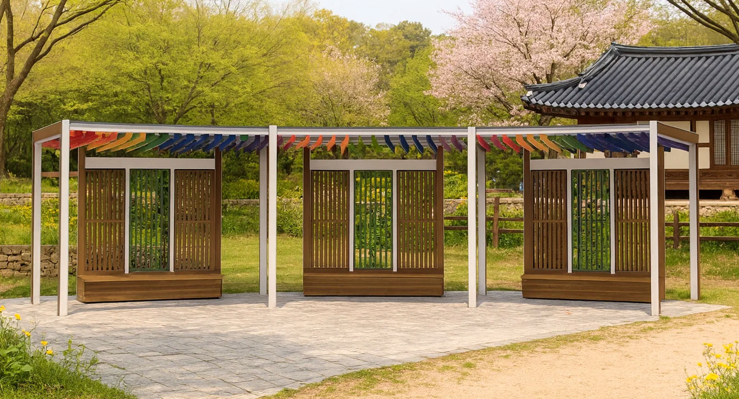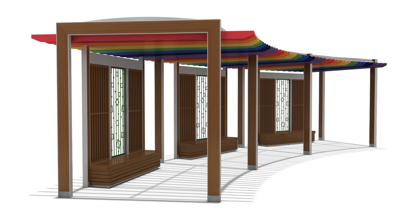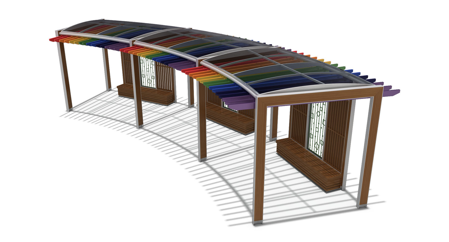 레인보우 커브 파빌리온 (Rainbow Curve Pavilion)|PNDP-769 제품목록으로 바로가기 자료 및 바로가기 나라장터 바로연결 도면 다운로드 시공사진 보러가기 기타 곡선형 지붕 아래 컬러 루버를 배치해 밝고 활기 있는 분위기를 만든 파빌리온입니다. 투명 지붕이 개방감을 주고, 우드 포인트가 자연스러운 조화를 완성합니다. 제품명 레인보우 커브 파빌리온 (Rainbow Curve Pavilion)|PNDP-769 물품식별번호 24955841 규격 11,593 X 4,648 X 2,905(H) 재질 stl, galvanized, hard wood, polycarbonate 레인보우 커브 파빌리온 (Rainbow Curve Pavilion)|PNDP-769 물품식별번호 24955841 규격 11,593 X 4,648 X 2,905(H) 재질 stl, galvanized, hard wood, polycarbonate 기타 곡선형 지붕 아래 컬러 루버를 배치해 밝고 활기 있는 분위기를 만든 파빌리온입니다. 투명 지붕이 개방감을 주고, 우드 포인트가 자연스러운 조화를 완성합니다. 자료 및 바로가기 나라장터 바로연결 도면 다운로드 시공사진 보러가기