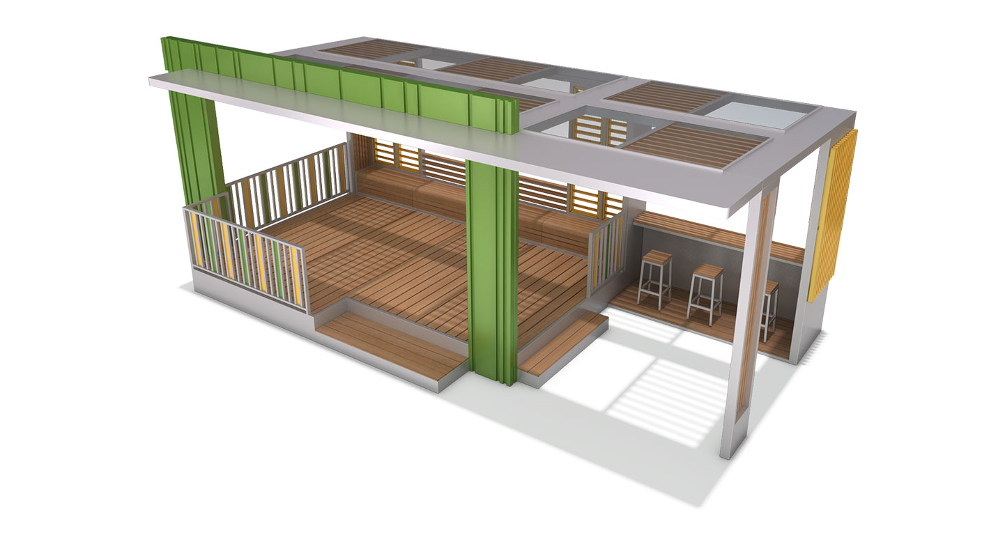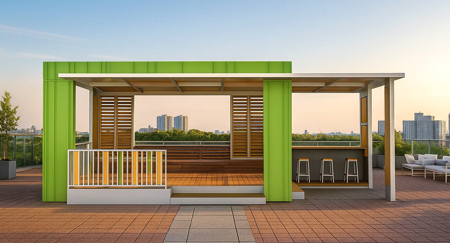 루프라임 파빌리온 (Roof Lime Pavilion)|PNDP-743 제품목록으로 바로가기 자료 및 바로가기 나라장터 바로연결 도면 다운로드 시공사진 보러가기 기타 라임그린 포인트 프레임과 우드 루버 조합으로 활기 있고 세련된 공간을 연출했습니다. 루프탑 환경에 맞게 개방성과 활용성을 높였고, 바 테이블·휴식 벤치 등을 배치해 이용자 경험을 극대화했습니다. 제품명 루프라임 파빌리온 (Roof Lime Pavilion)|PNDP-743 물품식별번호 24965823 규격 8,510 X 4,050 X 3,390(H) 재질 stl, galvanized, hard wood, polycarbonate 루프라임 파빌리온 (Roof Lime Pavilion)|PNDP-743 물품식별번호 24965823 규격 8,510 X 4,050 X 3,390(H) 재질 stl, galvanized, hard wood, polycarbonate 기타 라임그린 포인트 프레임과 우드 루버 조합으로 활기 있고 세련된 공간을 연출했습니다. 루프탑 환경에 맞게 개방성과 활용성을 높였고, 바 테이블·휴식 벤치 등을 배치해 이용자 경험을 극대화했습니다. 자료 및 바로가기 나라장터 바로연결 도면 다운로드 시공사진 보러가기