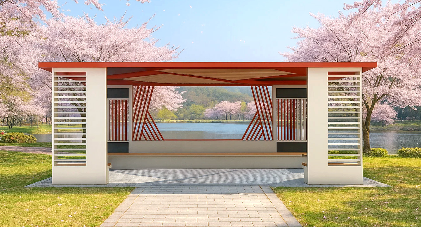 스프링 라인 파빌리온 (Spring Line Pavilion)|PNDP-714 제품목록으로 바로가기 자료 및 바로가기 나라장터 바로연결 도면 다운로드 시공사진 보러가기 기타 사선 구조와 레드 포인트 컬러로 봄의 생동감을 담아낸 퍼걸러입니다. 개방감 있는 구조와 리듬감 있는 패턴이 주변 풍경을 더욱 돋보이게 하며, 벚꽃길·호수공원·산책로에 특별한 분위기를 더해주는 디자인입니다. 제품명 스프링 라인 파빌리온 (Spring Line Pavilion)|PNDP-714 물품식별번호 24955667 규격 7,000 X 3,600 X 2,600(H) 재질 stl, galvanized, hard wood, polycarbonate 스프링 라인 파빌리온 (Spring Line Pavilion)|PNDP-714 물품식별번호 24955667 규격 7,000 X 3,600 X 2,600(H) 재질 stl, galvanized, hard wood, polycarbonate 기타 사선 구조와 레드 포인트 컬러로 봄의 생동감을 담아낸 퍼걸러입니다. 개방감 있는 구조와 리듬감 있는 패턴이 주변 풍경을 더욱 돋보이게 하며, 벚꽃길·호수공원·산책로에 특별한 분위기를 더해주는 디자인입니다. 자료 및 바로가기 나라장터 바로연결 도면 다운로드 시공사진 보러가기