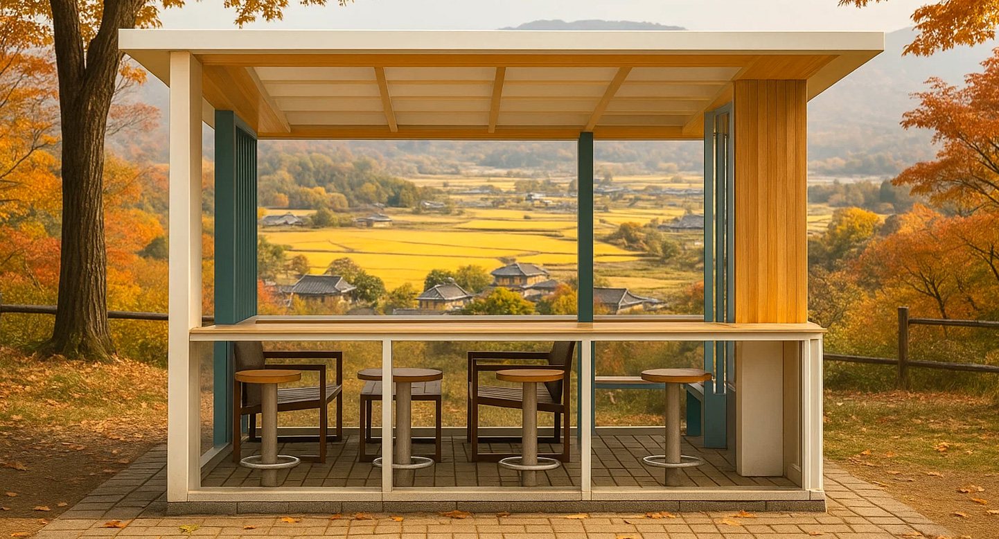뷰 테라스 스테이션 (View Terrace Station)|PNDP-026 제품목록으로 바로가기 자료 및 바로가기 나라장터 바로연결 도면 다운로드 시공사진 보러가기 기타 따뜻한 우드와 산뜻한 컬러 프레임을 조합해 풍경을 가장 편안하게 감상할 수 있는 전망형 쉼터입니다. 넓은 개방감과 바 테이블 구성으로, 농촌·전망지·전원형 공원에서 머무는 시간을 더욱 여유롭게 만들어줍니다. 제품명 뷰 테라스 스테이션 (View Terrace Station)|PNDP-026 물품식별번호 24965783 규격 4,000 X 4,000 X 2,600(H) 재질 stl, hardwood, galvanized, polycarbonate 뷰 테라스 스테이션 (View Terrace Station)|PNDP-026 물품식별번호 24965783 규격 4,000 X 4,000 X 2,600(H) 재질 stl, hardwood, galvanized, polycarbonate 기타 따뜻한 우드와 산뜻한 컬러 프레임을 조합해 풍경을 가장 편안하게 감상할 수 있는 전망형 쉼터입니다. 넓은 개방감과 바 테이블 구성으로, 농촌·전망지·전원형 공원에서 머무는 시간을 더욱 여유롭게 만들어줍니다. 자료 및 바로가기 나라장터 바로연결 도면 다운로드 시공사진 보러가기