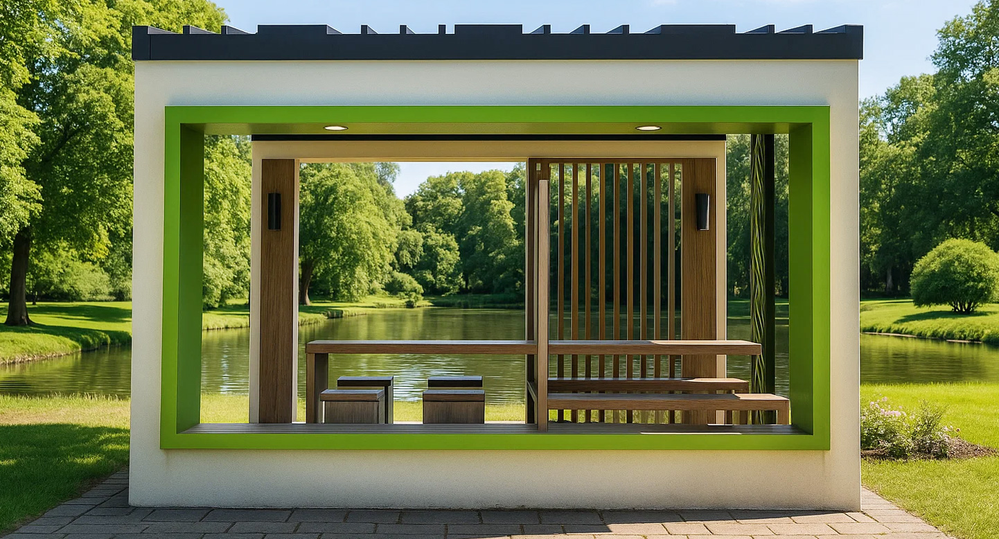 그린프레임 파빌리온 (Green Frame Pavilion)|PNDP-020 제품목록으로 바로가기 자료 및 바로가기 나라장터 바로연결 도면 다운로드 시공사진 보러가기 기타 (조명포함) 선명한 그린 프레임과 우드 슬랫로 자연 풍경을 깔끔하게 담아낸 개방형 쉼터입니다. 벤치·테이블 구성으로 휴식과 소규모 이용에 적합합니다. 제품명 그린프레임 파빌리온 (Green Frame Pavilion)|PNDP-020 물품식별번호 24965771 규격 3,900 X 3,900 X 3,000(H) 재질 stl, hardwood, galvanized, polycarbonate 그린프레임 파빌리온 (Green Frame Pavilion)|PNDP-020 물품식별번호 24965771 규격 3,900 X 3,900 X 3,000(H) 재질 stl, hardwood, galvanized, polycarbonate 기타 (조명포함) 선명한 그린 프레임과 우드 슬랫로 자연 풍경을 깔끔하게 담아낸 개방형 쉼터입니다. 벤치·테이블 구성으로 휴식과 소규모 이용에 적합합니다. 자료 및 바로가기 나라장터 바로연결 도면 다운로드 시공사진 보러가기