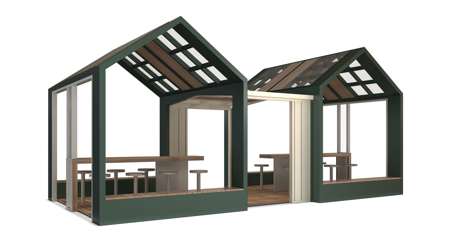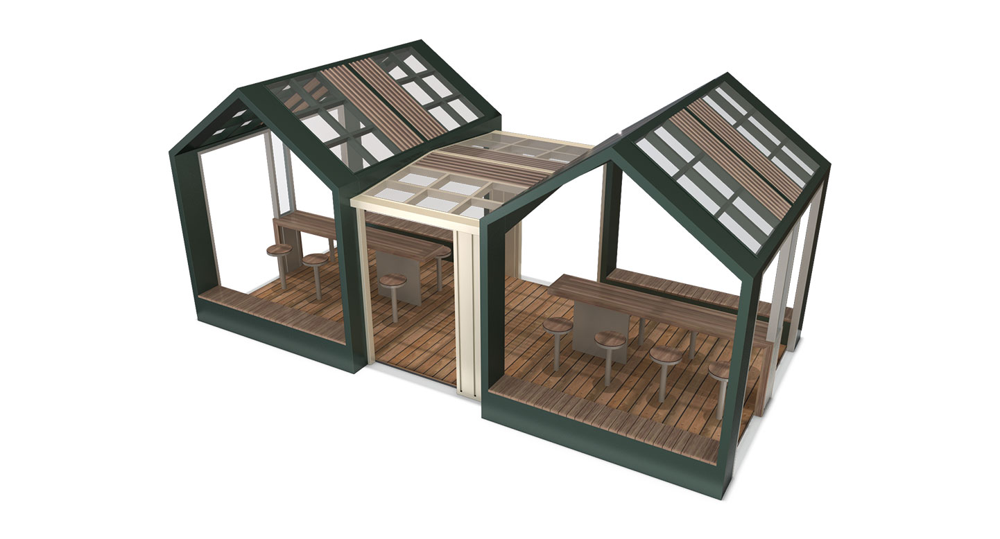 트리플 하우스 커뮤니티 라운지 (Triple House Community Lounge)|PNDP-013 제품목록으로 바로가기 자료 및 바로가기 나라장터 바로연결 도면 다운로드 시공사진 보러가기 기타 세 개의 하우스형 모듈을 투명 루프와 개방 구조로 연결한 쉼터로, 자연광과 우드 데크가 어우러져 휴식·독서·소모임이 가능한 다목적 라운지 공간입니다. 제품명 트리플 하우스 커뮤니티 라운지 (Triple House Community Lounge)|PNDP-013 물품식별번호 24965767 규격 8,000 X 4,000 X 3,700(H) 재질 stl, hard wood, galvanized, polycarbonate,강화유리 트리플 하우스 커뮤니티 라운지 (Triple House Community Lounge)|PNDP-013 물품식별번호 24965767 규격 8,000 X 4,000 X 3,700(H) 재질 stl, hard wood, galvanized, polycarbonate,강화유리 기타 세 개의 하우스형 모듈을 투명 루프와 개방 구조로 연결한 쉼터로, 자연광과 우드 데크가 어우러져 휴식·독서·소모임이 가능한 다목적 라운지 공간입니다. 자료 및 바로가기 나라장터 바로연결 도면 다운로드 시공사진 보러가기