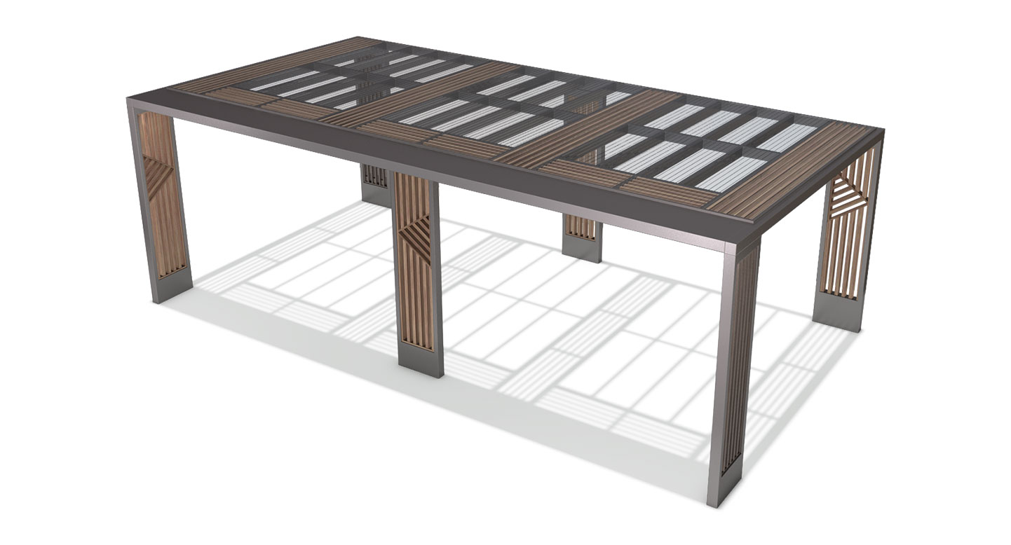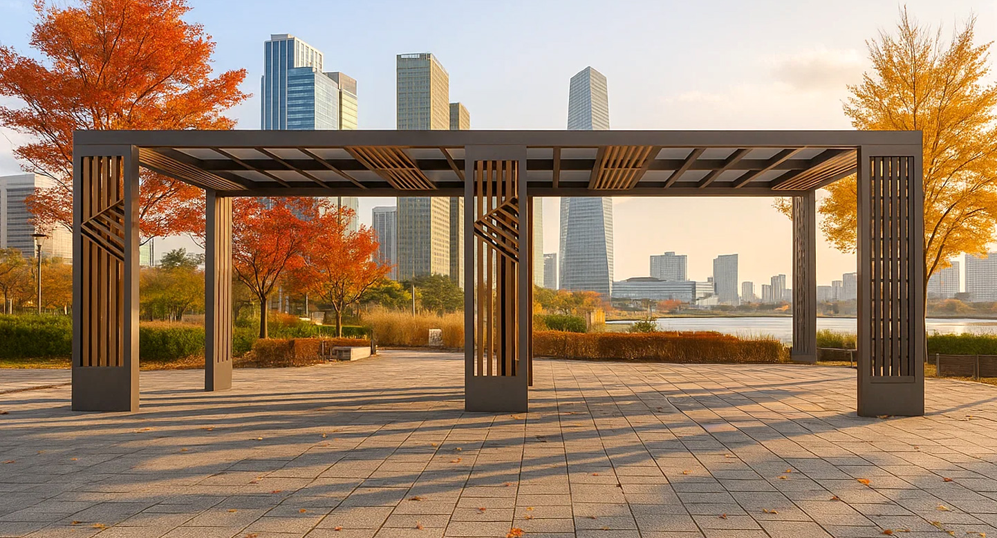 어반 리프 퍼걸러 (Urban Leaf Pergola)|PDP-057 제품목록으로 바로가기 자료 및 바로가기 나라장터 바로연결 도면 다운로드 시공사진 보러가기 기타 슬림한 프레임과 리프 패턴 슬랫을 적용해 도시 경관과 자연 풍경을 동시에 담아낸 퍼걸러입니다. 빛이 투과되는 구조로 시간대별 그림자가 변화하며, 호수공원·광장·도심 산책로에 품격 있는 휴식 공간을 제공합니다. 제품명 어반 리프 퍼걸러 (Urban Leaf Pergola)|PDP-057 물품식별번호 23810250 규격 7,450 X 4,000 X 2,600(H) 재질 stl,hardwood, polycarbonate,galvanized 어반 리프 퍼걸러 (Urban Leaf Pergola)|PDP-057 물품식별번호 23810250 규격 7,450 X 4,000 X 2,600(H) 재질 stl,hardwood, polycarbonate,galvanized 기타 슬림한 프레임과 리프 패턴 슬랫을 적용해 도시 경관과 자연 풍경을 동시에 담아낸 퍼걸러입니다. 빛이 투과되는 구조로 시간대별 그림자가 변화하며, 호수공원·광장·도심 산책로에 품격 있는 휴식 공간을 제공합니다. 자료 및 바로가기 나라장터 바로연결 도면 다운로드 시공사진 보러가기