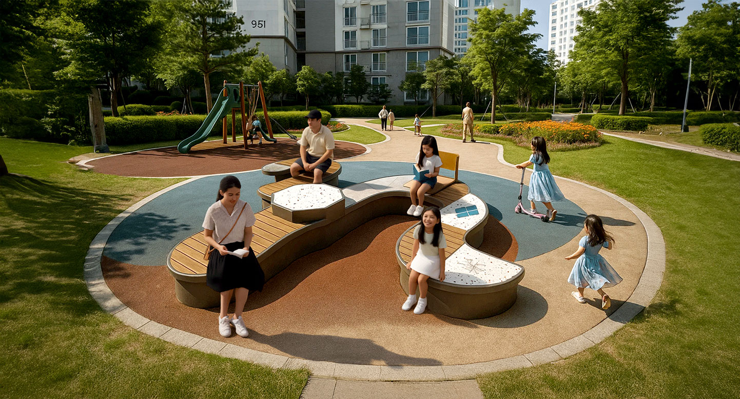 플로우 가든(Flow Garden) 플레이벤치|PND-BB025-055 제품목록으로 바로가기 자료 및 바로가기 나라장터 바로연결 도면 다운로드 시공사진 보러가기 기타 물의 흐름과 자연 곡선을 모티브로 한 유선형 조합벤치입니다. 우드·테라조·HPL을 조합해 공간에 리듬감과 생동감을 더하며,아이들의 놀이와 탐색·소통을 유도하는 다기능 벤치입니다. 제품명 플로우 가든(Flow Garden) 플레이벤치|PND-BB025-055 물품식별번호 26027581 규격 4200×3425×690mm 재질 stl, galvanized, hard wood, hpl 플로우 가든(Flow Garden) 플레이벤치|PND-BB025-055 물품식별번호 26027581 규격 4200×3425×690mm 재질 stl, galvanized, hard wood, hpl 기타 물의 흐름과 자연 곡선을 모티브로 한 유선형 조합벤치입니다. 우드·테라조·HPL을 조합해 공간에 리듬감과 생동감을 더하며,아이들의 놀이와 탐색·소통을 유도하는 다기능 벤치입니다. 자료 및 바로가기 나라장터 바로연결 도면 다운로드 시공사진 보러가기