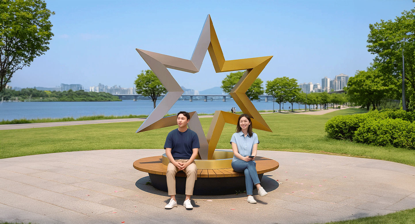 스타 모먼트(Star Moment) 아트벤치|PND-BB025-045 제품목록으로 바로가기 자료 및 바로가기 나라장터 바로연결 도면 다운로드 시공사진 보러가기 기타 찬란한 ‘순간의 별’을 형상화한 랜드마크 벤치입니다. 황금·실버톤 입체 구조가 도전과 희망을 상징하며, 빛에 따라 변화하는 조형미를 제공합니다. 중앙 원형 데크는 사람들을 모아주는 휴식 중심 공간입니다. 제품명 스타 모먼트(Star Moment) 아트벤치|PND-BB025-045 물품식별번호 26027570 규격 2600×2600×3260mm 재질 stl, galvanized, hard wood 스타 모먼트(Star Moment) 아트벤치|PND-BB025-045 물품식별번호 26027570 규격 2600×2600×3260mm 재질 stl, galvanized, hard wood 기타 찬란한 ‘순간의 별’을 형상화한 랜드마크 벤치입니다. 황금·실버톤 입체 구조가 도전과 희망을 상징하며, 빛에 따라 변화하는 조형미를 제공합니다. 중앙 원형 데크는 사람들을 모아주는 휴식 중심 공간입니다. 자료 및 바로가기 나라장터 바로연결 도면 다운로드 시공사진 보러가기