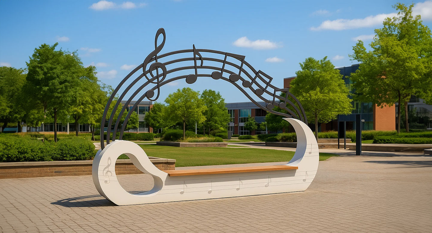 멜로딕 아치(Melodic Arch) 아트벤치|PND-BB025-044 제품목록으로 바로가기 자료 및 바로가기 나라장터 바로연결 도면 다운로드 시공사진 보러가기 기타 음표의 곡선을 아치로 구현한 조형벤치로, 도시의 활기와 감성을 시각적으로 표현했습니다. 우드 좌판과 금속 음표 라인이 조화를 이루며, 오선지 형태의 하부 구조로 ‘멜로디가 흐르는 포토존’을 완성합니다. 제품명 멜로딕 아치(Melodic Arch) 아트벤치|PND-BB025-044 물품식별번호 26027569 규격 4300×500×2824mm 재질 stl, galvanized, hard wood 멜로딕 아치(Melodic Arch) 아트벤치|PND-BB025-044 물품식별번호 26027569 규격 4300×500×2824mm 재질 stl, galvanized, hard wood 기타 음표의 곡선을 아치로 구현한 조형벤치로, 도시의 활기와 감성을 시각적으로 표현했습니다. 우드 좌판과 금속 음표 라인이 조화를 이루며, 오선지 형태의 하부 구조로 ‘멜로디가 흐르는 포토존’을 완성합니다. 자료 및 바로가기 나라장터 바로연결 도면 다운로드 시공사진 보러가기