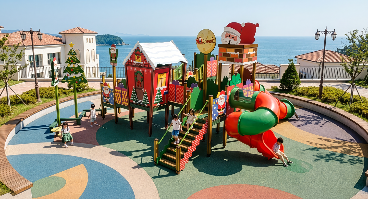 산타하우스 키즈파크 (Santa House Kids Park)|PNDPG-011-2 제품목록으로 바로가기 자료 및 바로가기 나라장터 바로연결 도면 다운로드 시공사진 보러가기 기타 산타 하우스·루돌프·트리 장식으로 크리스마스 분위기를 담은 테마 복합놀이대입니다. 그린·레드·우드톤과 슬라이드·터널·클라이밍 동선을 연결해 아이들이 ‘산타 마을을 탐험하는 듯’ 즐길 수 있도록 구성했습니다. 제품명 산타하우스 키즈파크 (Santa House Kids Park)|PNDPG-011-2 물품식별번호 25356554|안전인증번호 : CA023H10037-3002 규격 11.125×9.866×4.745(H) 재질 stl, hpl, pe, hard wood 산타하우스 키즈파크 (Santa House Kids Park)|PNDPG-011-2 물품식별번호 25356554|안전인증번호 : CA023H10037-3002 규격 11.125×9.866×4.745(H) 재질 stl, hpl, pe, hard wood 기타 산타 하우스·루돌프·트리 장식으로 크리스마스 분위기를 담은 테마 복합놀이대입니다. 그린·레드·우드톤과 슬라이드·터널·클라이밍 동선을 연결해 아이들이 ‘산타 마을을 탐험하는 듯’ 즐길 수 있도록 구성했습니다. 자료 및 바로가기 나라장터 바로연결 도면 다운로드 시공사진 보러가기